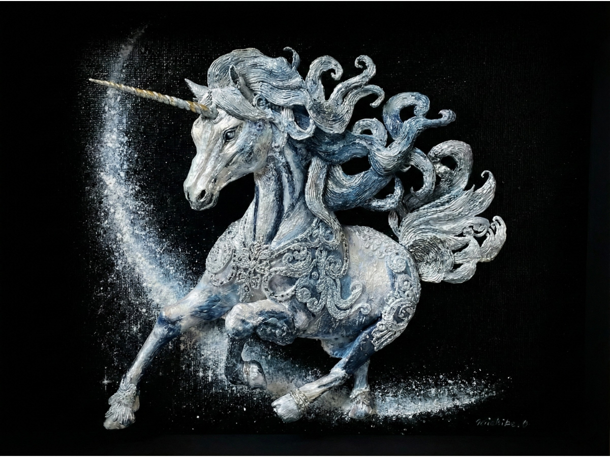 碧の光を纏い、宇宙空間を駆け抜けるユニコーンの姿。この作品には、静謐な威厳と深い慈しみが共存する”守護の魂”が込められています。